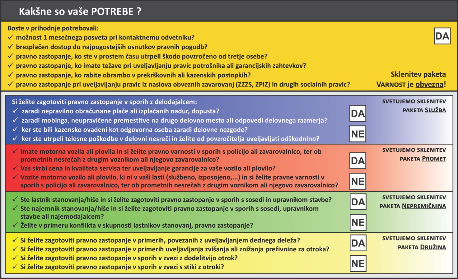Zavarovanje pravne zaščite v različnih paketih krije tudi druge, najpogostejše spore, s katerimi se lahko srečamo mi ali naši družinski člani. Preberite in odgovorite na spodnja vprašanja, kjer so navedeni najpogostejši primeri, ki jih krije naše zavarovanje: